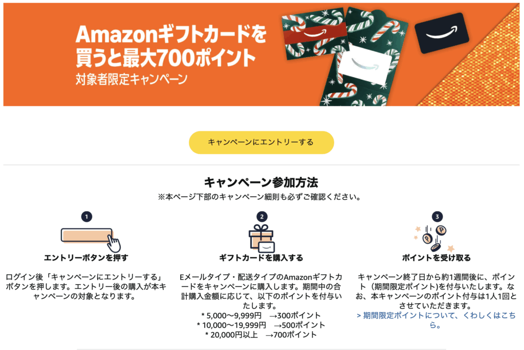 もらえます。ライトユーザーは5万円まで買えて、最大1500Pもらえるそうです。自分はこのページにあるギフトカードじゃなく、チャージをしてしまったので気をつけてください。このページにあるギフトカードのEメールか配送タイプを選んで、任意の金額を指定してください。