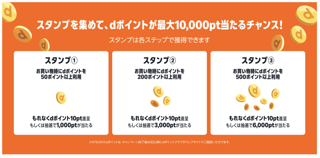 お買い物時に、1.50dポイント使うと、dポイント10pt獲得、抽選で1000pt。2.買い物時に200pt以上利用で、もれなく10pt獲得、抽選で3000pt。3.買い物時に500pt利用で、もれなく10pt獲得、6000pt抽選というスタンプラリーに参加できます。何もしなくてもPtが溜まっていくのでぜひ参加してください。