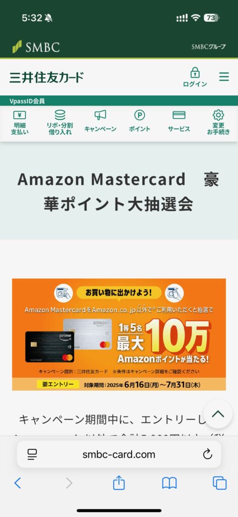 Amazon MasterCardは先だって、Amazon以外で5000円以上買い物をすると、抽選でAmazonポイント10万ポイント5名、1000ポイント50名、100ポイント9945名に当たるキャンペーンをしていましたが、みなさん参加なされたでしょうか?
