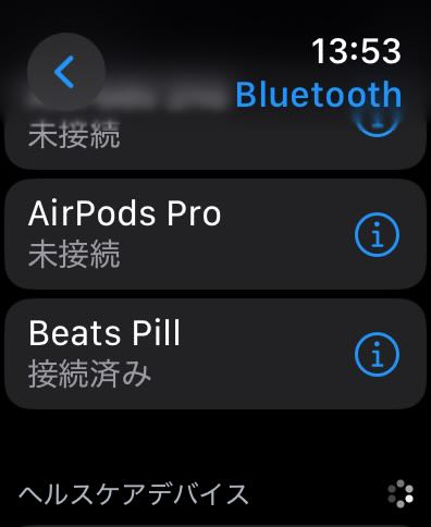 AppleWatchとBeats Pillを接続して再生することも可能です。同一IDであれば、[設定]-[Bluetooth]にBeats Pillが表示されているので接続して、ミュージックを立ち上げるだけです。