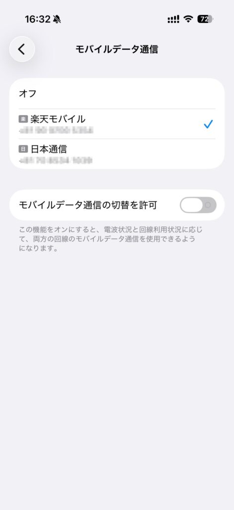 そして、重要なのはモバイル通信で「モバイルデータ通信の切替を許可」を必ずOFFにすることです。楽天側でも日本通信側でも同じようにOFFにしてください。そうしないとAPNを入れると関係ない楽天モバイルの回線が死んでしまったりします。
