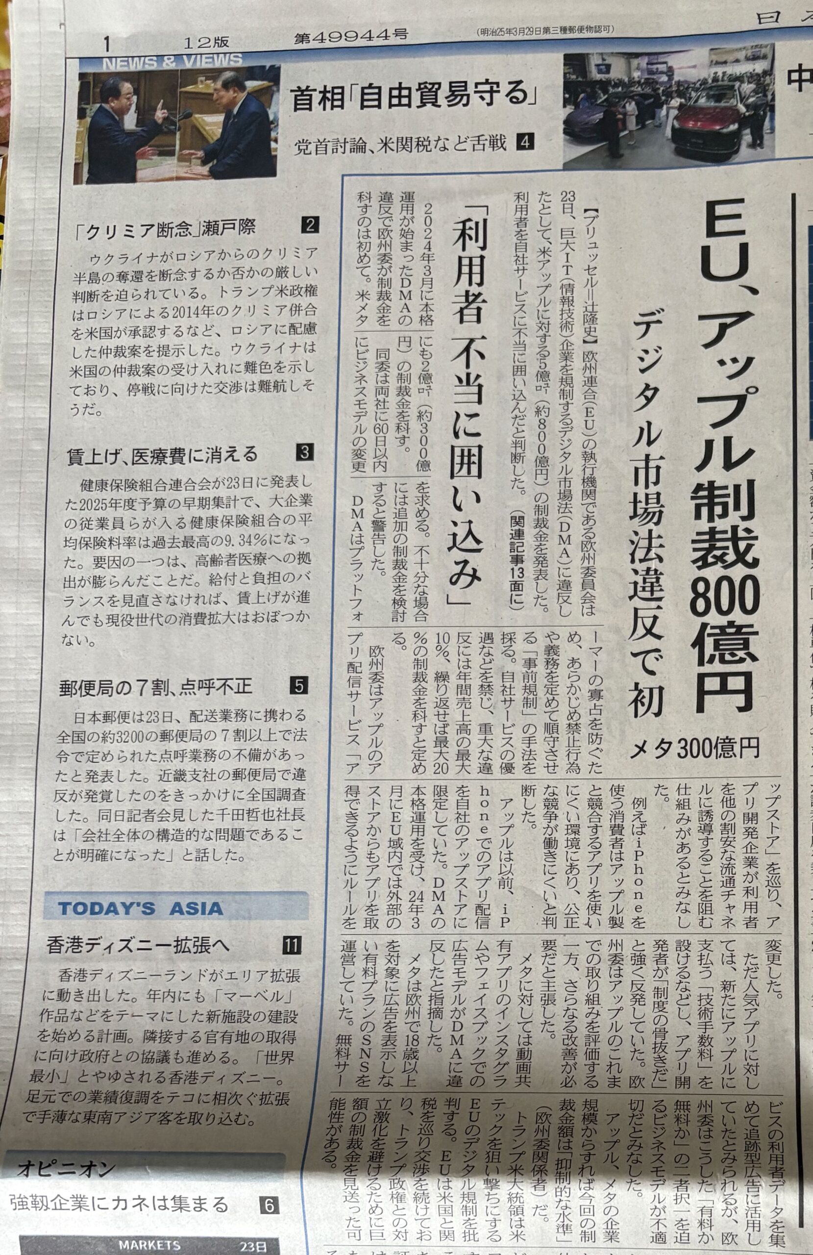EUの執行機関である欧州委員会は、23日、巨大IT企業を規制するデジタル市場法(DMA)に違反したとして、米Appleに5億ユーロ(800億円)の制裁金を課した。利用者を不正に囲い込んだと判断された。欧州委員会がDMA違反で制裁金を課すのは初めて。米Metaにも2億ユーロ(300億円)の制裁金を課す。