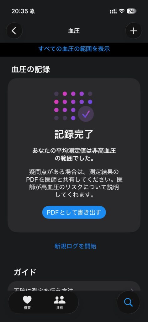 Appleは「すべての高血圧を特定できるわけではない」として家庭での測定を推奨しています。それでも大規模な臨床実験からかなり正確な判断になると思われます。自分の父親も高血圧でオムロンの血圧計で毎日測定し、降血剤を服用しています。知り合いの看護師さんによると定期的に測定して、自分の血圧がどのくらいか把握しておくことは良いことですと言っていました。血圧計で測るとこのようなPDFを30日で書き出すことができ、