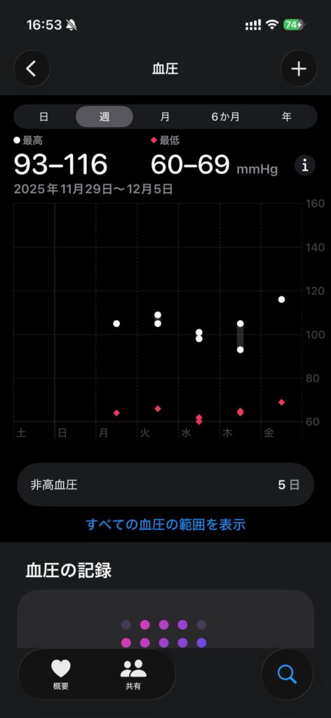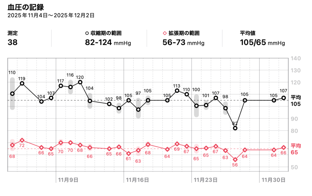 ぼくは年なので、スマホ対応の血圧計を購入して毎日測定していますが、非高血圧だと30日でこのような結果が出ます。