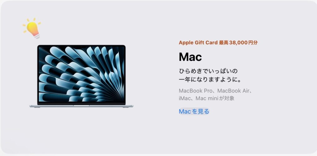 またMacは、MacBook Proも対象で最大38,000円還元になります。MacBook Air、Mac mini、iMacも対象。MacBook Airの還元率が高くなっていますが、MacBook Pro(M4 Pro/M4 Max)で38,0000円狙うのもあり。ただ、MacBook Airは3月にM5 MacBook Airが出る可能性が高いです。