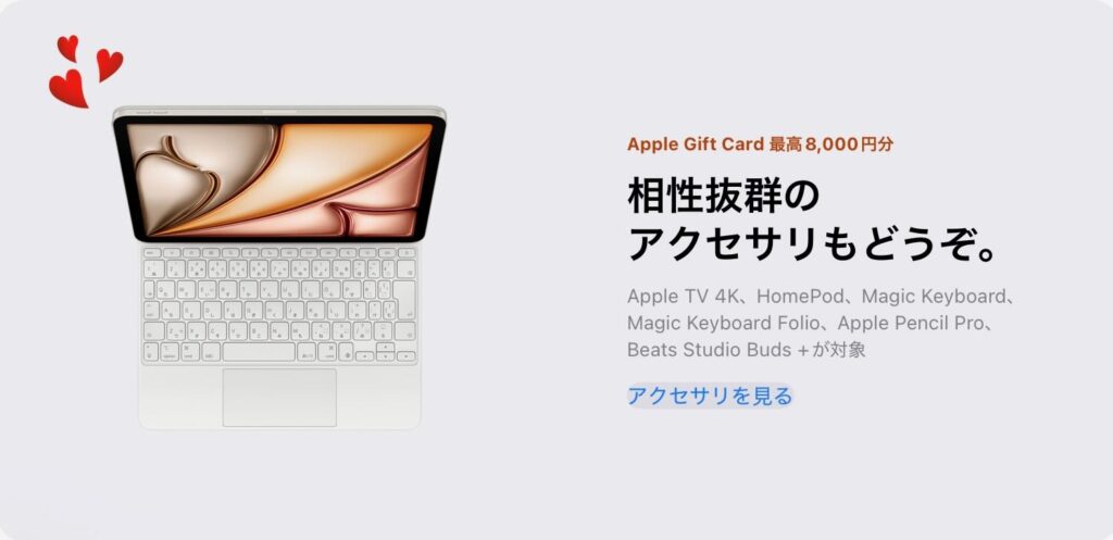 アクセサリーは、Apple TV 4K. HomePod. Magic Keyboard.Magic Keyboard Folio, Apple Pencil Pro.Beats Studio Buds +が対象。Magic Keyboardは高いので還元があるのは嬉しいです。HomePodは空間オーディオにも対応してワンランク上の音楽体験ができるほか、AppleTVとの組み合わせも最強。ただ、3月にHomePod mini第二世代が出ると言われており、HomePodに投資するかは微妙なところ。