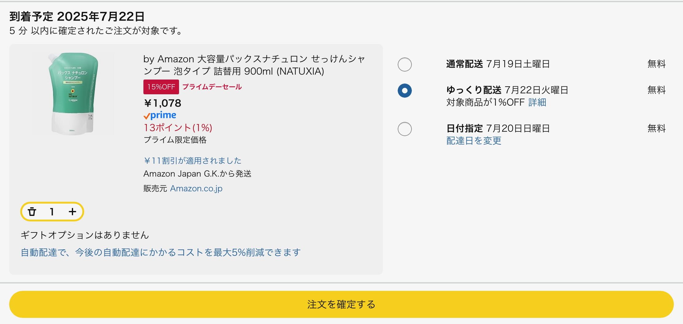 Amazonは前々から配達員の負担軽減のため配送を遅らすと割引になる制度を導入予定でしたが、この程、プライムデー最終日に「ゆっくり配送」というオプションが付き、配送はほぼ1週間後ながら、対象商品は1%オフになるという特典が付きました。